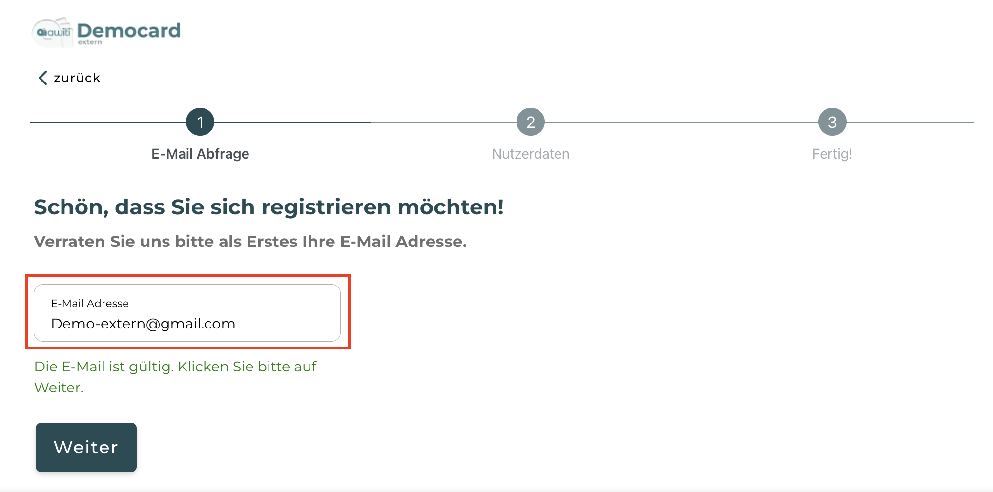 Geben Sie Ihre E-Mail-Adresse ein und klicken Sie auf „Weiter".