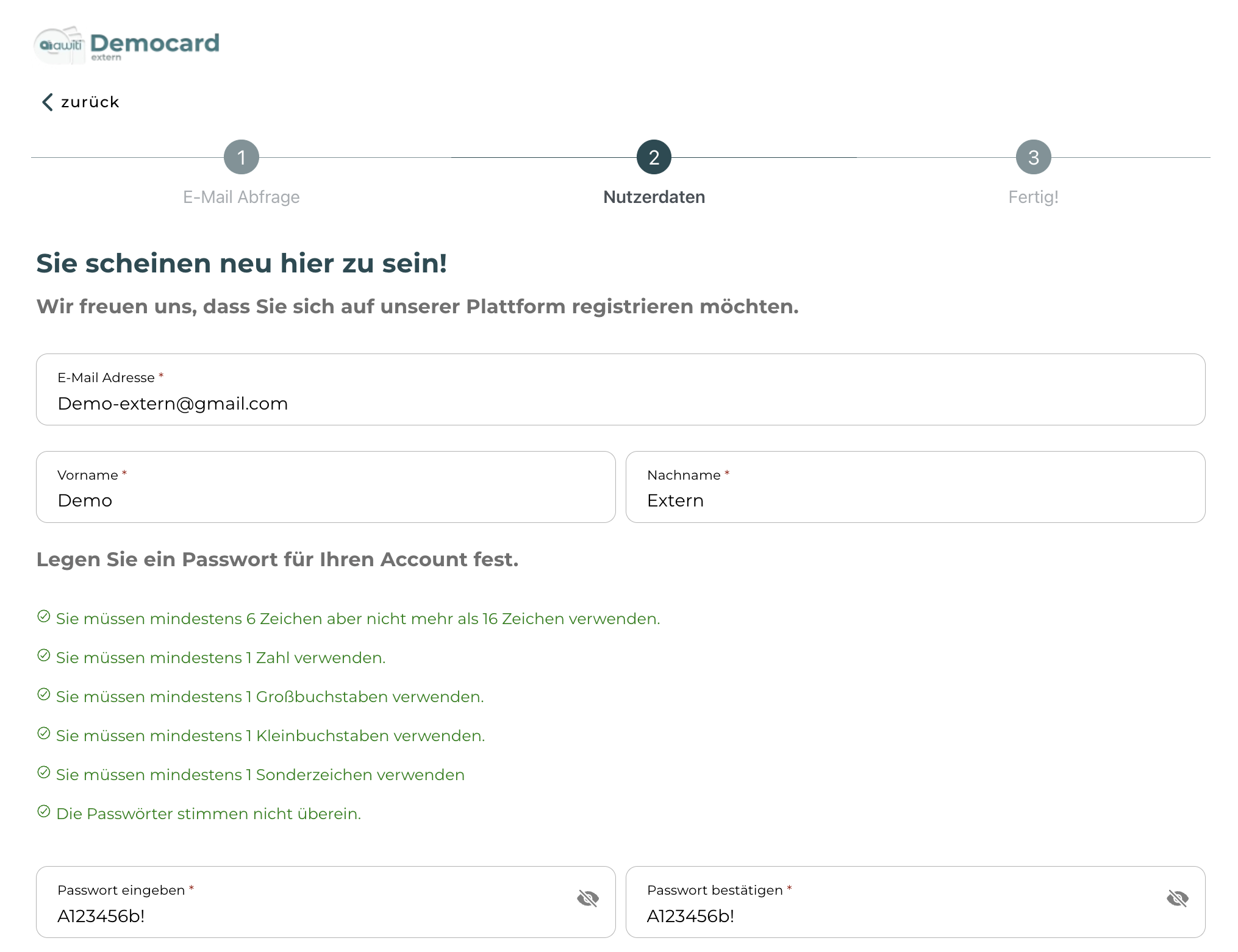 Die Vorgaben für die Erstellung des Passworts werden Ihnen oberhalb des Passwortfeldes angezeigt. Wenn diese grün erscheinen, erfüllt Ihr Passwort alle Anforderungen und wird von der Webseite akzeptiert.