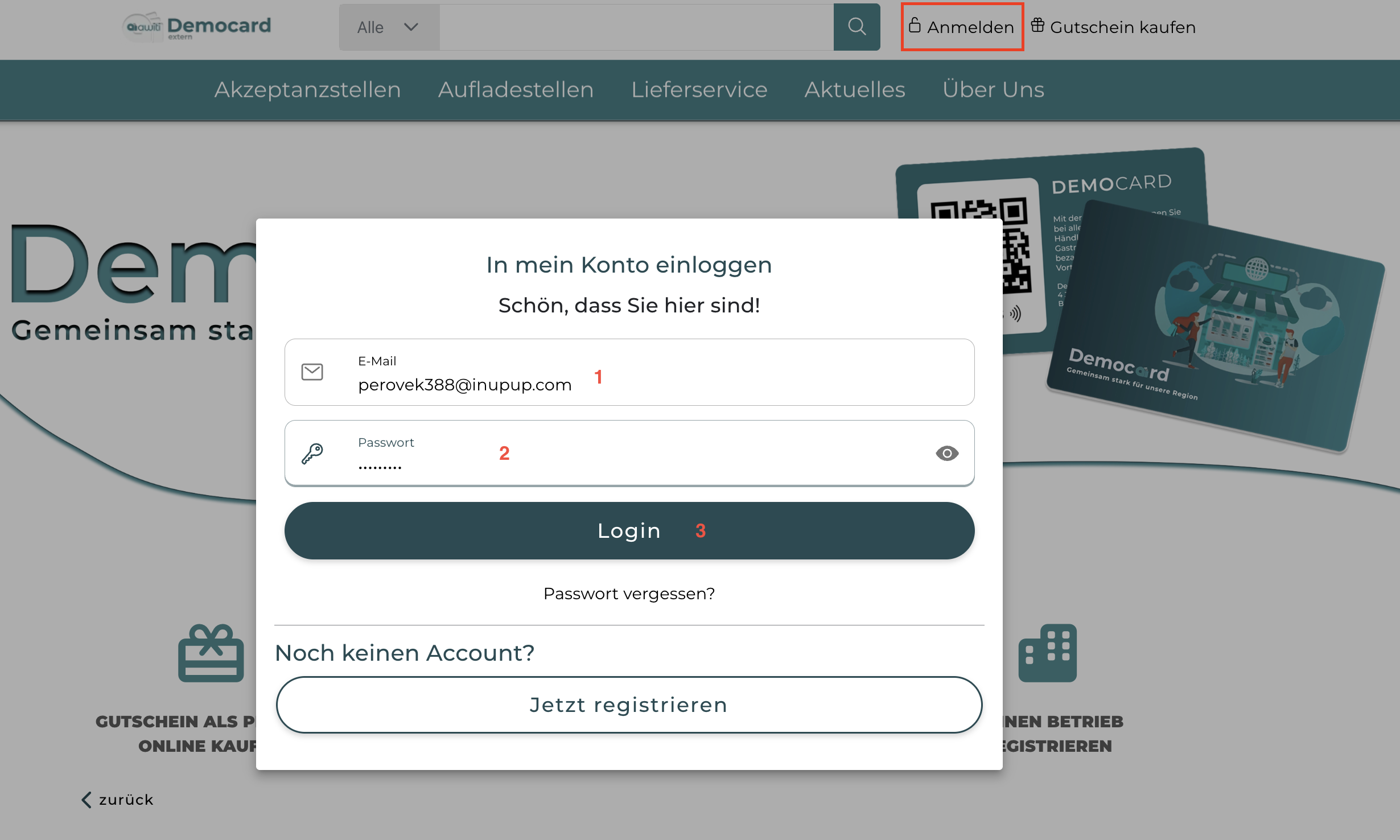 Besuchen Sie die Webseite Ihres Gutscheinanbieters. Klicken Sie dann oben rechts auf „Anmelden", um mit der Registrierung zu beginnen.