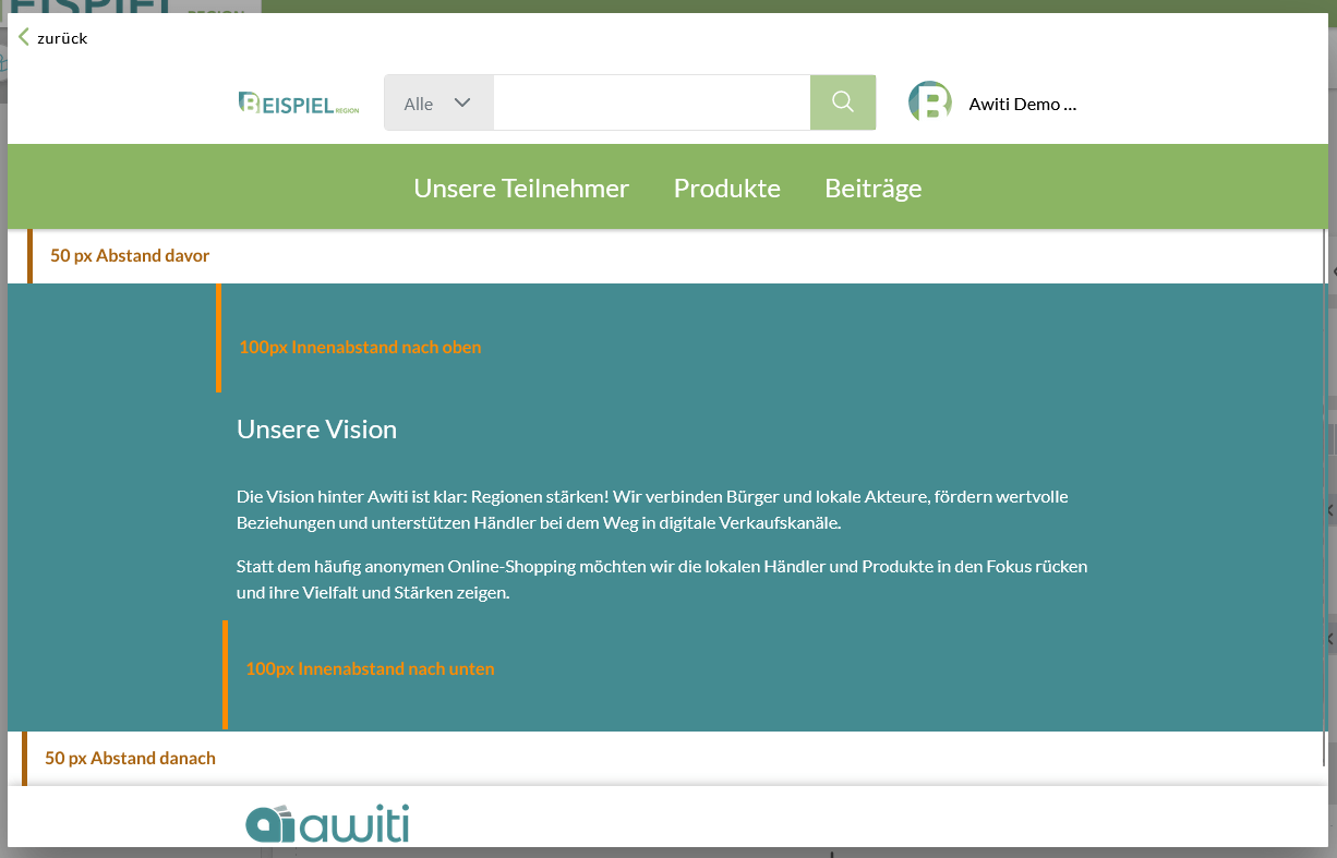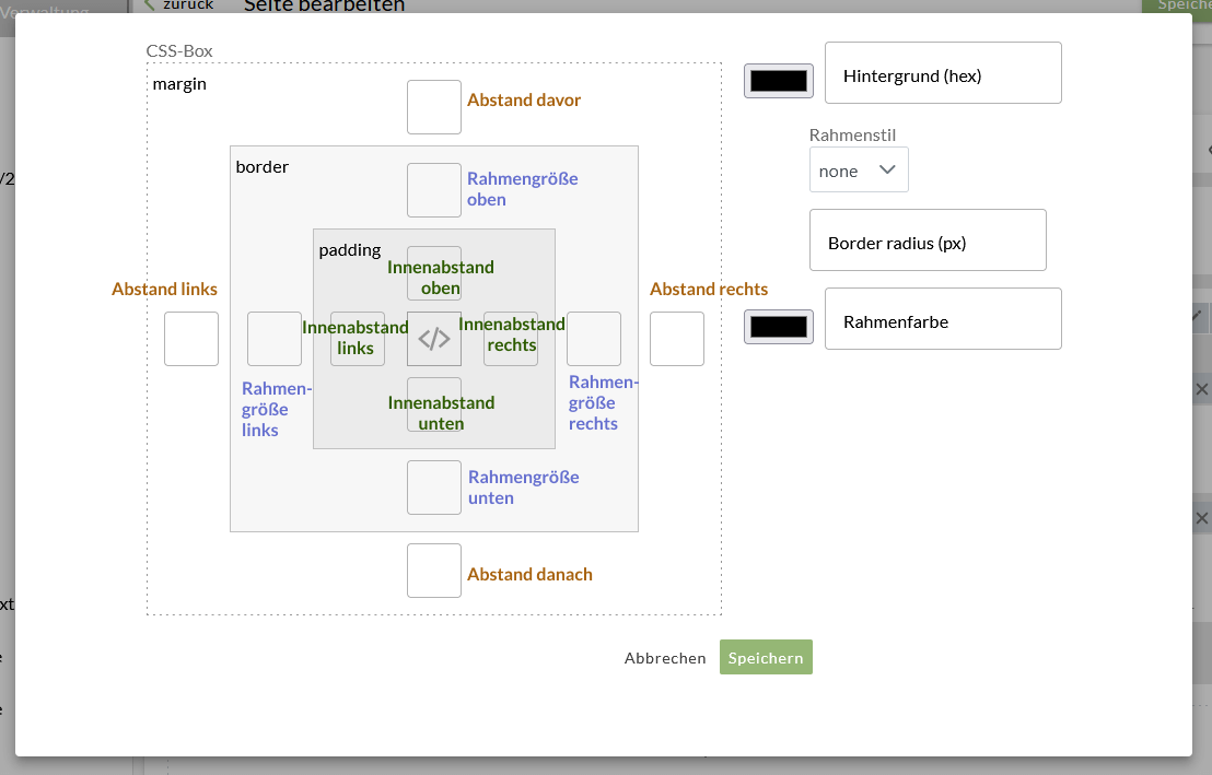 Mit der CSS-Box können Sie Einstellungen zum Abstand und Hintergrund von Inhaltszeilen und Inhaltselementen vornehmen. Im Folgenden finden Sie Erläuterungen zu den einzelnen Elementen sowie konkrete Anwendungsbeispiele.