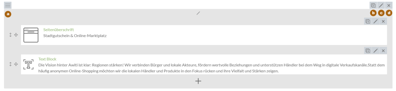 Neue Inhaltszeile: Um eine neue Inhaltszeile zu erstellen, nutzen Sie den "Plus"-Button unterhalb der grauen Inhaltszeile. Sie können beliebig viele erstellen und gestalten.