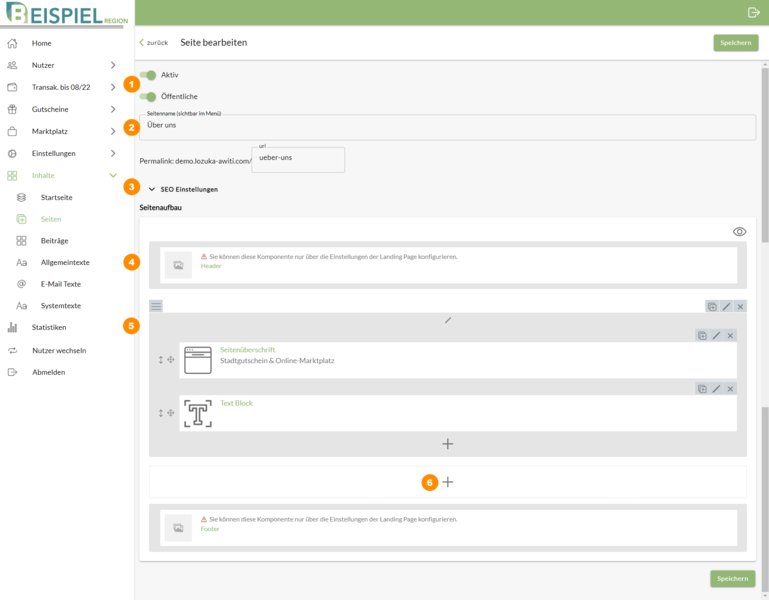 Header und Footer sind zentrale Elemente, die auf sämtlichen Seiten erscheinen. Wenn Sie diese ändern, werden die Anpassungen automatisch überall übernommen. Richten Sie diese Grundelemente (siehe 3 & 4) deshalb zuerst ein.