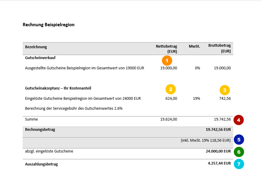 Von dem Wert der eingelösten Gutscheine wird die errechnete Summe aus ausgestellten Gutscheinen und Servicegebühr abgezogen, um den Auszahlungsbetrag zu ermitteln.