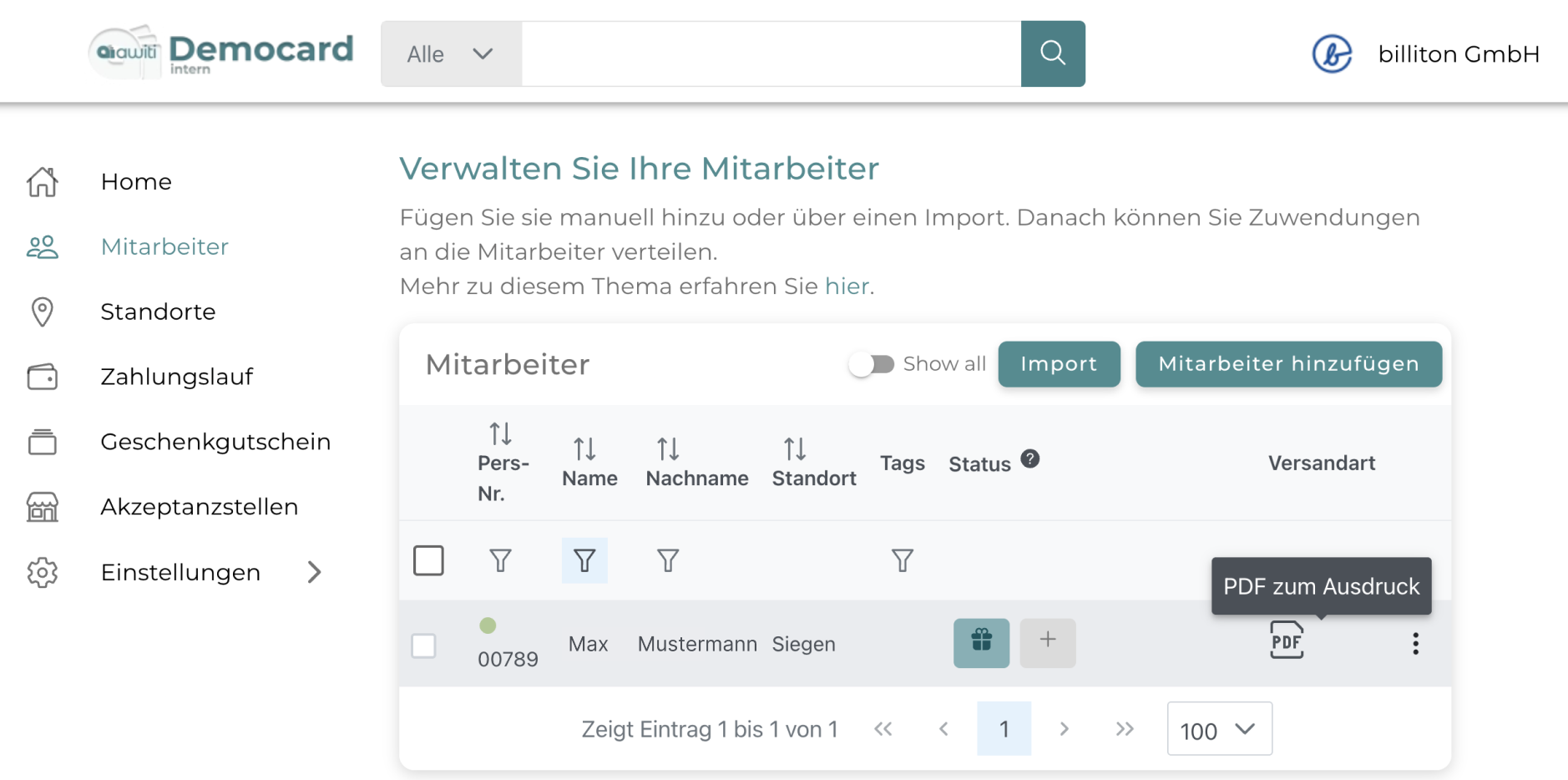 ✔ Ist keine E-Mail-Adresse hinterlegt, können Sie den Gutschein als PDF im Mitarbeiterportal unter „Mitarbeiter" herunterladen und dem zugehörigen Mitarbeiter händisch aushändigen (siehe Foto).