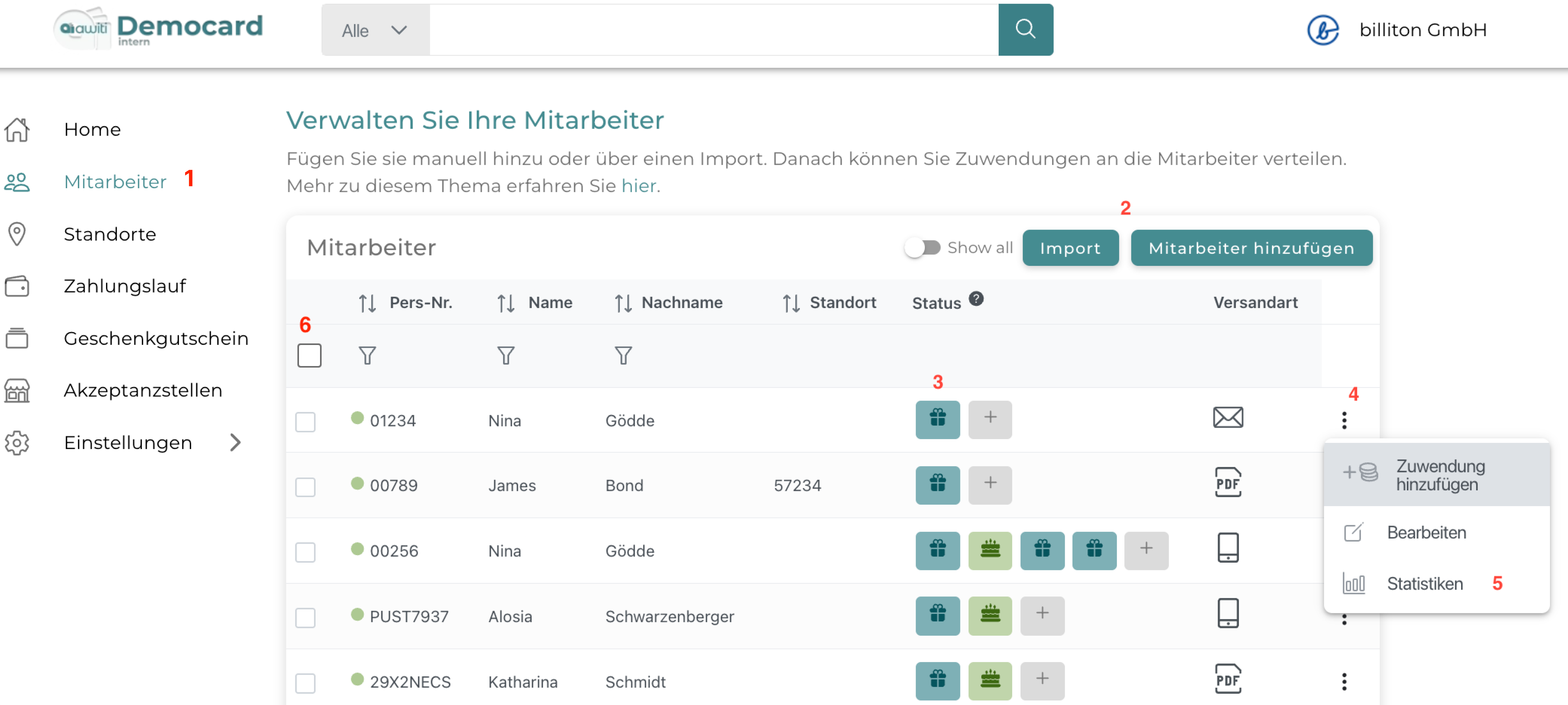 Tipp: Über die Checkbox-Auswahl links lassen sich auch mehrere Mitarbeitende gleichzeitig bearbeiten (siehe 6)