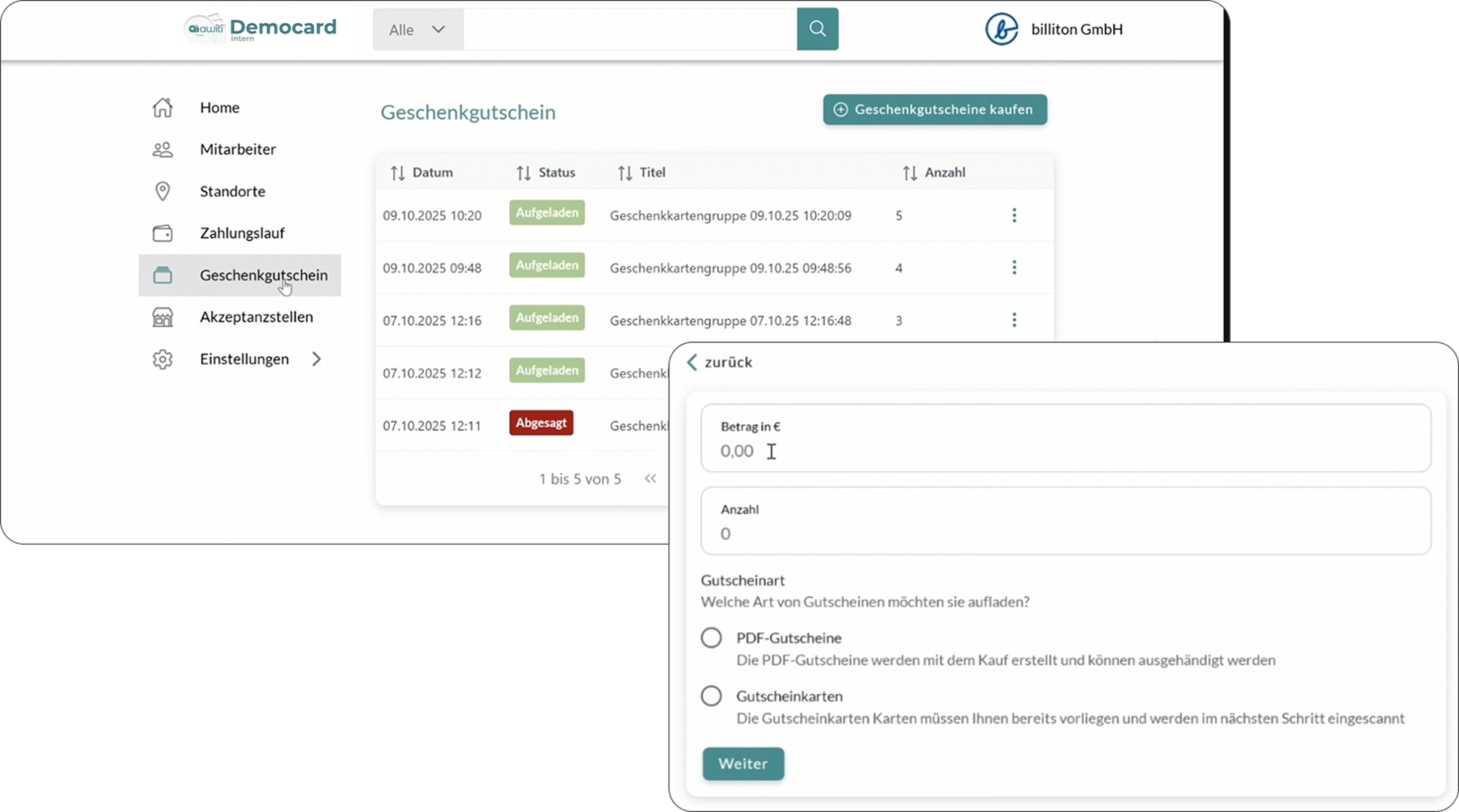• Übersichtliche Verwaltung: Alle bestellten und aufgeladenen Gutscheine werden zentral in einer Liste angezeigt